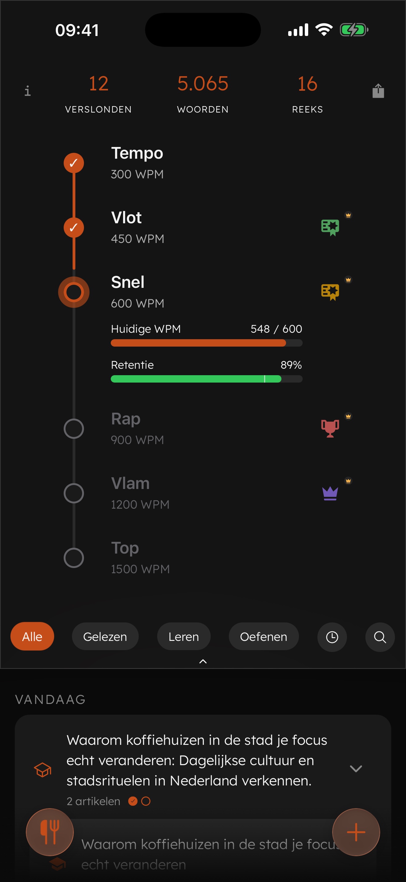 Wat nu ongemakkelijk voelt, zal na een paar sessies helemaal vanzelf gaan. Snelheden die vandaag onmogelijk lijken, zoals 900 of zelfs 1200 woorden per minuut, worden met oefening echt haalbaar. Stel je voor hoeveel je op die snelheid zou kunnen leren.